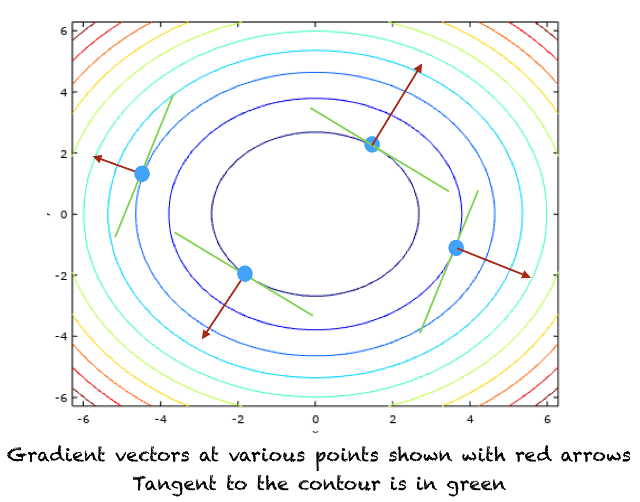 f[x_, y_] := x^2 + y^2 gradient[x_, y_] := {2x, 2y} Show[ Plot3D[f[x, y], {x, -2, 2}, {y, -2, 2}, PlotRange -> {0, 8}, AxesLabel -> {"x", "y", "f(x, y)"}, MeshFunctions -> {#3 &}, MeshStyle -> {{Thick, Red}}, Lighting -> "Neutral"], VectorPlot[gradient[x, y], {x, -2, 2}, {y, -2, 2}, VectorStyle -> {{Thick, Blue}}, VectorPoints -> 10] ]