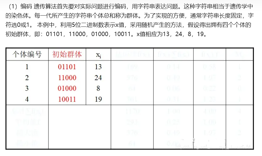 染色体作为遗传物质的主要载体,即多个基因的集合,其内部表现(即基因型)是某种基因组合,它决定了个体的形状的外部表现,如黑头发的特征是由染色体中控制这一特征的某种基因组合决定的。因此,在一开始需要实现从表现型到基因型的映射即编码工作。由于仿照基因编码的工作很复杂,我们往往进行简化,如二进制编码。