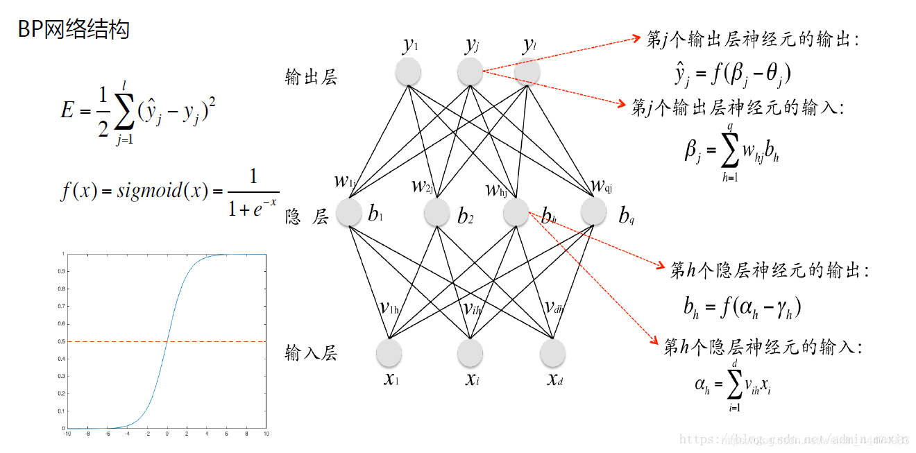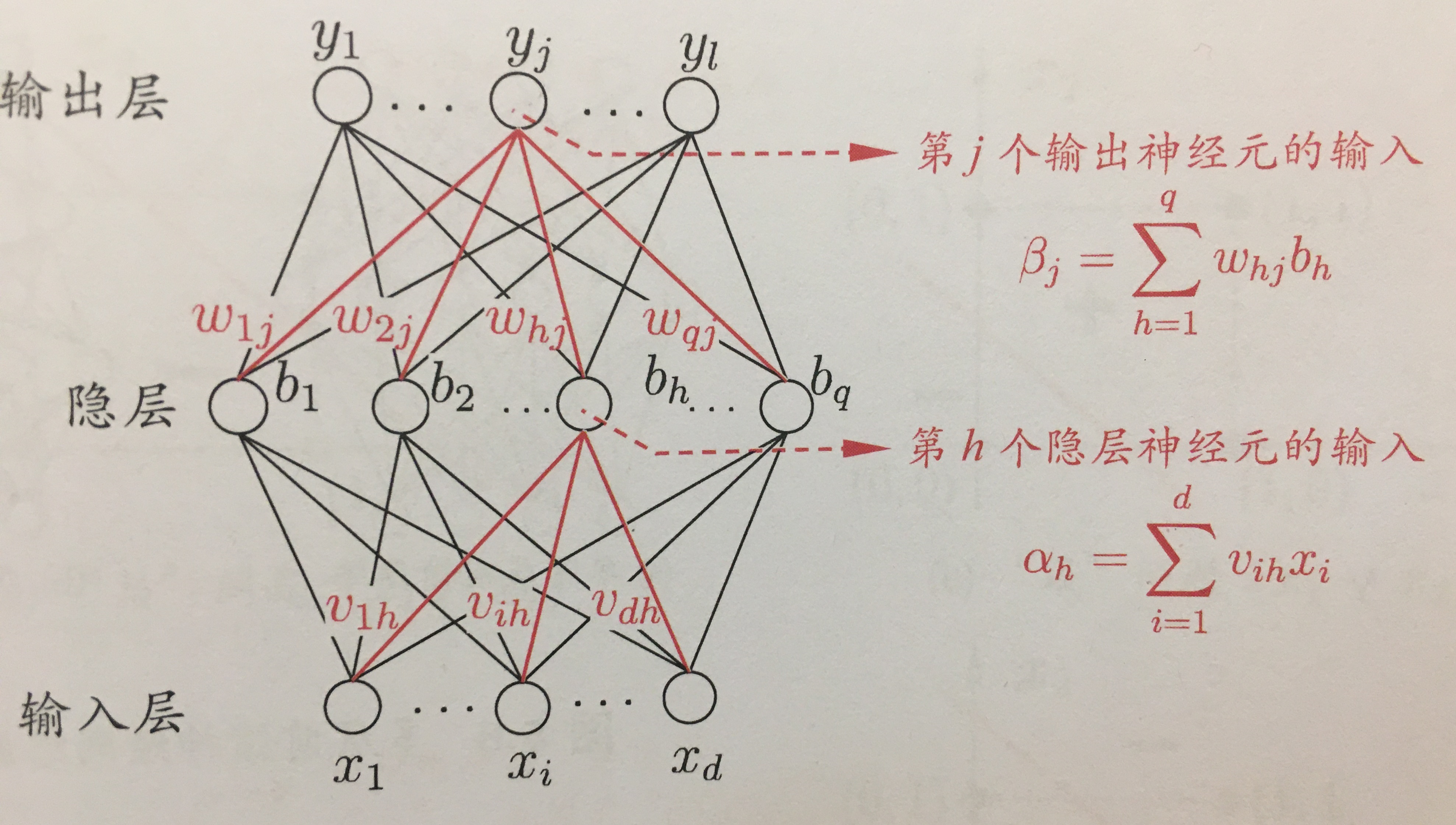 其中输入层神经元接收外界输入, 隐层与输出层神经元对信号进行加工, 最终结果由输出层神经元输出; 换言之, 输入层神经元仅是接受输入, 不进行函数处理, 隐层与输出层包含功能神经元.