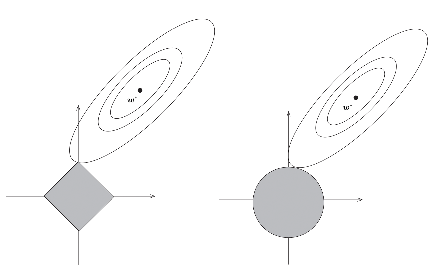 lasso 限制了w的取值范围为有棱角的方形,而 ridge 限制了w的取值范围为圆形,等高线和方形区域的切点更有可能在坐标轴上,而等高线和圆形区域的切点在坐标轴上的概率很小。