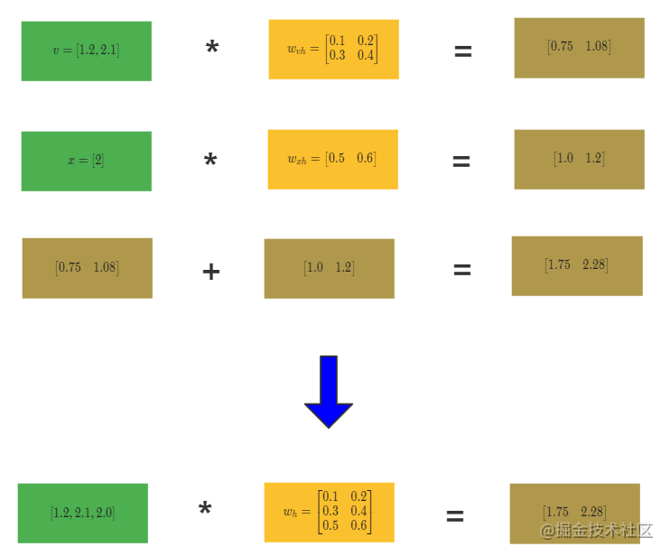 一个简单的例子进行说明隐含的输出(v)和对应的输入(x)共用一个矩阵:隐含变量为二维,输入的为一维,目的是得到新的隐含输入即二维。