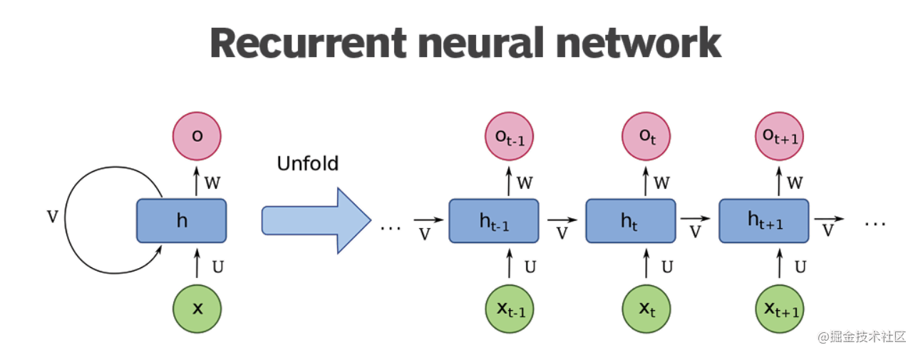 循环神经网络区别于其他神经网络在于循环二字,这里的循环是指隐含的输出(v)重新输入隐含权重参与模型训练,不同时刻的输入(X)也要放入隐含层权重中。隐含权重是循环到不同时间段其参数不一样,但隐含权重是共用的,注意在图中unfold下隐含权重矩阵只是一个矩阵(隐含的输出(v)和对应的输入(x)共用一个矩阵),之所以呈现多个是为了对应不同的时刻。