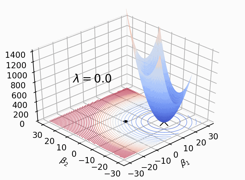 损失函数为蓝红色(蓝色 = 较低,红色 = 较高损失),正则化惩罚项为橙色,原点 (0,0)